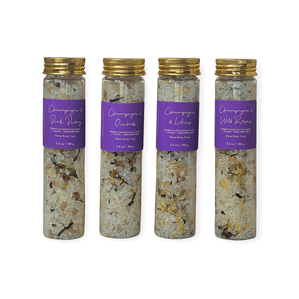Perfect as a gift or as a special treat for yourself, this bath salt collection elevates your bath time to a sensory celebration. Treat yourself to the rejuvenating benefits of mineral-rich salts and the intoxicating scents of champagne and flowers and let your skin soak in the luxury.